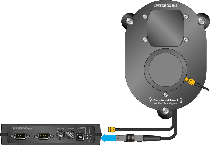 The INS sensor assembly is connected to the main SPEEDBOX unit, where the raw inertial and GPS outputs are combined in real time to accurately measure vehicle attitude (roll, pitch, yaw), acceleration, velocity, distance, gradient and heading as well as position. All measurements have a very low latency of just a few milliseconds, and are output at a rate of 200Hz with no interpolation. The dual antenna setup allows for very precise measurements between the two antennas (to within a few mm) so the yaw and pitch angle of the vehicle can be measured to a few tenths of a degree.