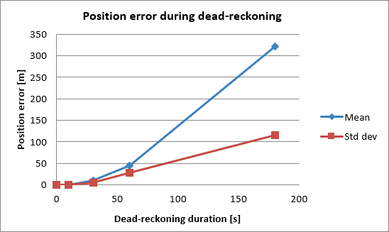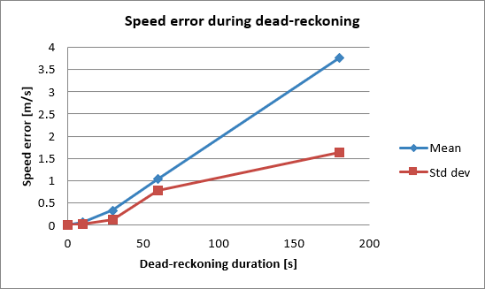 The dead reckoning performance of a system shows how well the system tracks speed and position when there is no GPS data at all. This gives a good indication of the performance through tunnels and under bridges. The main limiting factor on the dead reckoning performance for speed measurement is the accuracy of the pitch gyro. Drift on the gyro means that changes in gradient can be interpreted as acceleration changes which result in false changes to the speed.