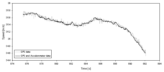 3. Combining the accelerometer data and the GPS data also has the effect of reducing the noise on the GPS speed signal whilst testing in imperfect GPS conditions. These imperfect conditions could be the result of driving past trees or intermittent lock from some satellites becoming obscured by buildings etc. The following example is very typical of data taken on a highway flanked by buildings. It is important to note that the speed data is not filtered in any way and there is no interpolation of the data, it is simply because the GPS and accelerometer data has been combined and the accelerometers have far lower noise – no dynamics are lost in the combining process.