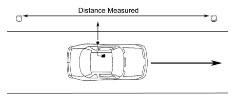 For the test, two reflective barriers were placed approximately 40 meters apart along a straight section of the test track. A high speed combined laser emitter/detector unit was mounted on the side window to shine out of the vehicle at 90° to the direction of travel, as illustrated below. As the beam hits each of the reflective barriers the laser sensor generates a pulse; producing a pulse at the start and end of the test distance.
