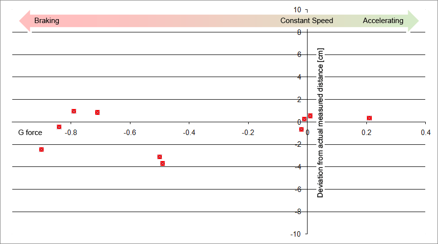The test was performed 10 times, driving through the barriers at different speeds, braking, accelerating and keeping constant speeds. The results in the graph below show the difference in cm between the actual distance and the SPEEDBOX-INS measured distance against the average g-force for each run. As explained above these results validate the SPEEDBOX-INS speed and distance measurement accuracy.