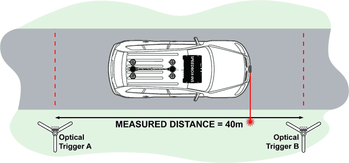 This test measures the combined accuracy of the speed measurement and the pulse output. Measuring the speed accuracy of the SPEEDBOX-INS by comparing the results to those of a reference speed measurement technology was not possible, to do so would require a technology which has proven accuracy much higher than that claimed by the SPEEDBOX-INS, and nothing is available which can provide this. As such, validation of the speed has to be done indirectly. For the test, two reflective barriers were placed approximately 40 meters apart along a straight section of the test track. A high speed combined laser emitter/detector unit was mounted on the vehicle to shine out of the vehicle at 90° to the direction of travel, as illustrated below. As the beam hits each of the reflective barriers the laser sensor generates a pulse; producing a pulse at the start and end of the test distance.