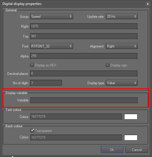 To assign a variable to a control (for example a digital display) the variable ID must be used. The variable ID for each variable can be found in the Variable list window (View -> Variable list)