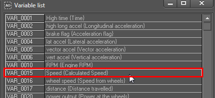 The following example shows how to use the variable list to find the variable ID for speed and assign it to a digital display control.