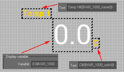 In the following example, a digital display and two simple text controls are configured to show the "temperature 1" variable (VAR_1000), variable name and unit name respectively.