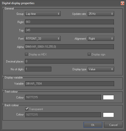 This example shows a digital display that displays the lap number (VAR_7004) for 10 seconds after crossing the lap marker: