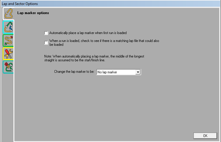 The Lap and Sector Options allow you to control the automatic adding of Track Markers. To access the Lap And Sectors Options, go to Data > Lap And Sector Options.