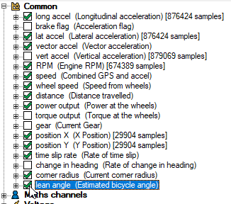 2. In the variable manager, you should enable the lean angle variable under the "Common" category as this is useful in bike data analysis.