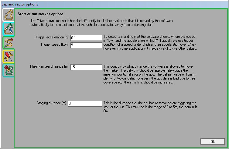 Analysis software moves the start of run marker to the exact time that the vehicle accelerates away from a standing start. To detect a standing start, the software checks where the speed is low and the acceleration is high; Typical values used here are speed under 5kph and an acceleration over 0.1g. However you can change these values based on the application.
