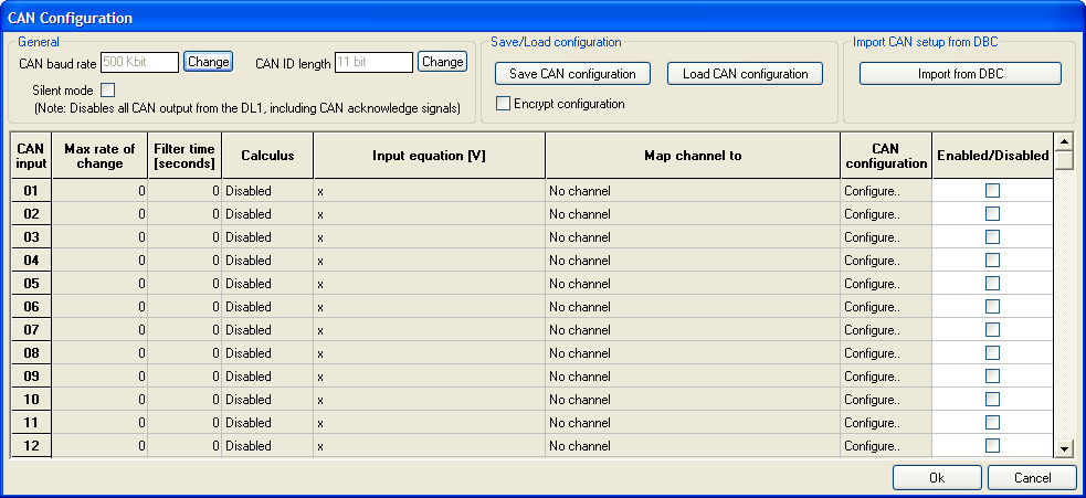 Before a CAN channel can be configured it must be enabled. Click on the 'Enabled/Disabled' box for the relevant channel and then click 'Configure..' to bring up the configuration screen.