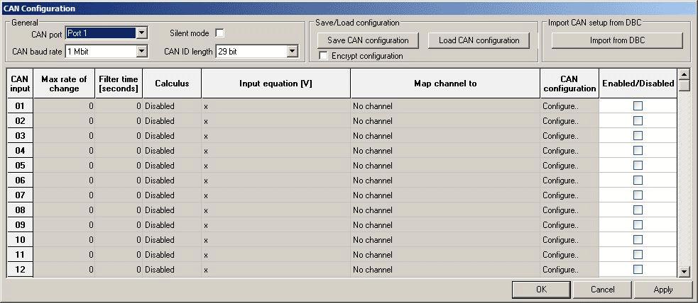 Loading and saving of the CAN configuration files is all done from the CAN inputs window:
