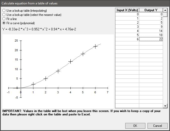When using custom equation it is possible to enter simple equations or to generate the output from a lookup table using interpolation, closest value, straight line fit or polynomial: