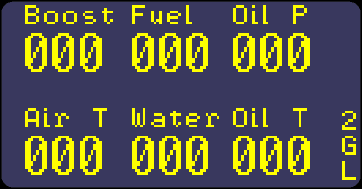 2. On screen 2 we are displaying critical vehicle data, Oil pressure, Water temperature, Fuel level, Boost pressure, Oil temperature and Air temperature. Note that this is set up assuming these sensors are wired into the DL1 and are set to output on the correct serial channels to the DASH4PRO. Pressure and temperature sensors are assumed to be standard Race Technology sensors; however fuel level is left to be calibrated by the user.