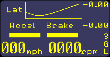 3. Screen 3 is set up to show both the absolute level of longitudinal (acceleration/braking) acceleration, and lateral (cornering) acceleration as both a fixed scale bar graph for longitudinal (0 to 1.4g), a scaled graph for lateral, and a simple text display. This screen is typically used for driver instruction.
