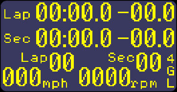 4. Screen 4 is set up with lap timing information, at the top left we have a display of the time into lap, below this we have the time into sector along with a lap counter and a display of the current sector. Also shown is the time slip and the time slip rate along with a small speed and RPM display