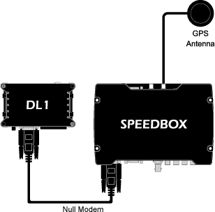 In this configuration, the GPS data is provided by the SPEEDBOX. The DL1 does not therefore require a GPS antenna. However, for the DL1 mk2, the files saved will not be time stamped if the DL1 does not have a GPS antenna attached, and therefore it is preferable, although not essential, to also add a GPS antenna to the DL1. For the DL1 mk3 this is not an issue, since it can correctly timestamp files using the incoming GPS serial data from the SPEEDBOX.