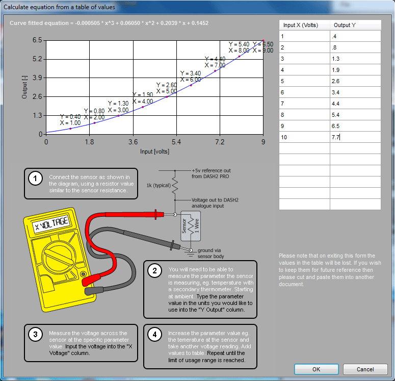 When the correct sensor type is selected the diagram at the bottom of the screen will change to show how the sensor is to be wired up. For the majority of sensors the equations are set up as default. Where the equation is to be entered manually, this can be done by clicking in the Equation box, which brings up a box to enter the equation values in to: