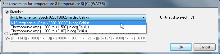 For non-standard sensors the input equation can be entered manually. By clicking on Custom the list of maths functions will be displayed. Equations can be entered using X as the input value, so a typical equation might be: