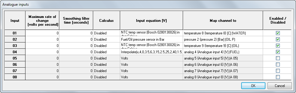Analogue input channels on the DASH2 PRO can be configured to be mapped directly through to temperature, pressure, angle, or auxiliary channels.