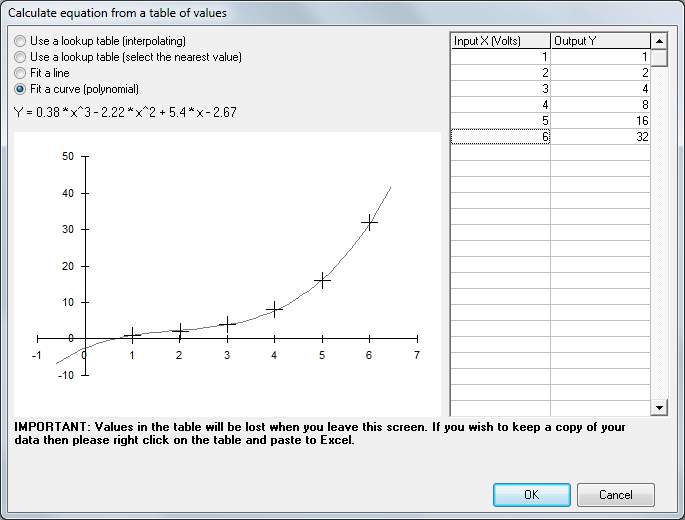 If required, data can be input from a table, by selecting Input Data From a Table the input voltages from the sensor and output readings can be entered.