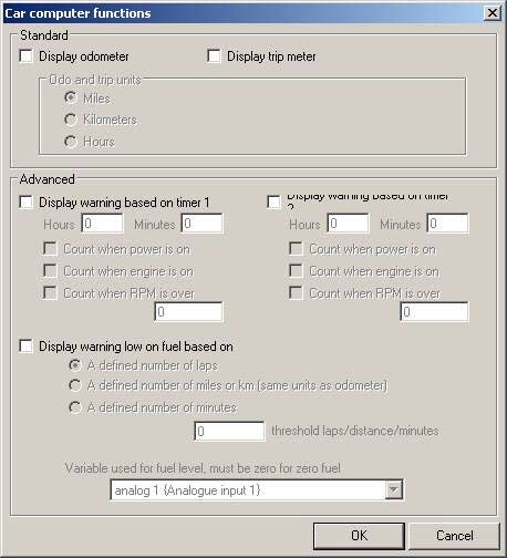 In addition to the standard odometer and trip meter display functions, it is possible to enable two additional warnings based on run time hours, power on hours, time over a certain rpm value and a third warning based on the amount of fuel remaining either in the number of laps, distance remaining or how many minutes are left based on recent fuel usage rates.