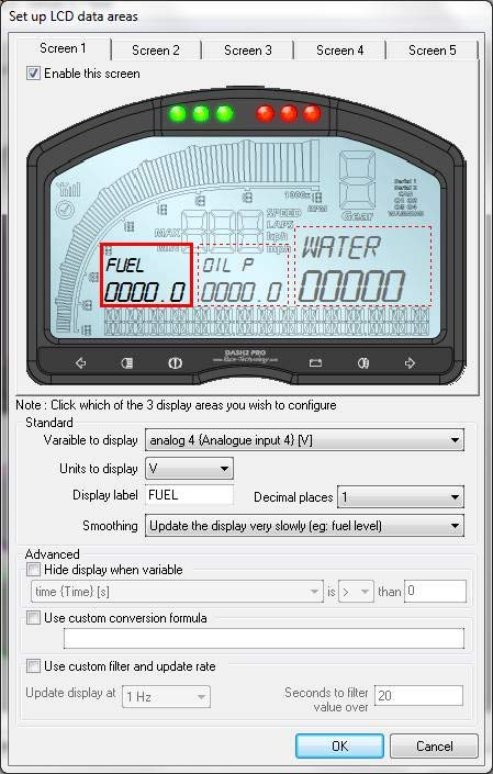 Each of the five available screens can be selected by ticking the 'enable this screen' option in the configuration software, then click on whichever of the three main display areas should be edited and select which channel of data should be viewed.