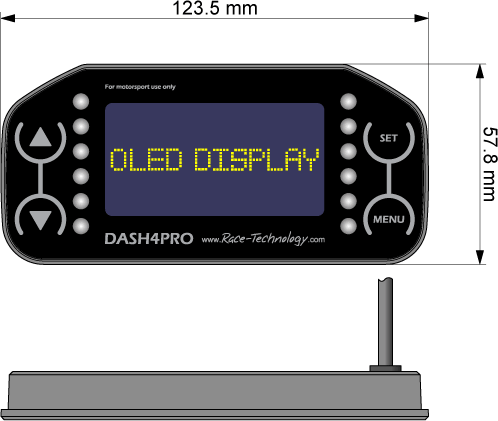 The DASH4PRO is designed to mount either on a steering wheel bracket or using the four blind holes on to a flat surface. There are 2 versions of the DASH4PRO, one with an OLED, and one with an LCD display - they are both the same overall size, though the LCD screen area is larger then the OLED screen area. Please see the diagrams below for hole dimensions and spacings: -