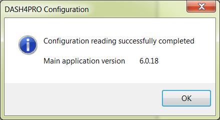 - Select the correct port and press Read configuration button. At the end of the Reading process, DASH4PRO will display a message with the firmware version (main application version inside DASH4PRO)