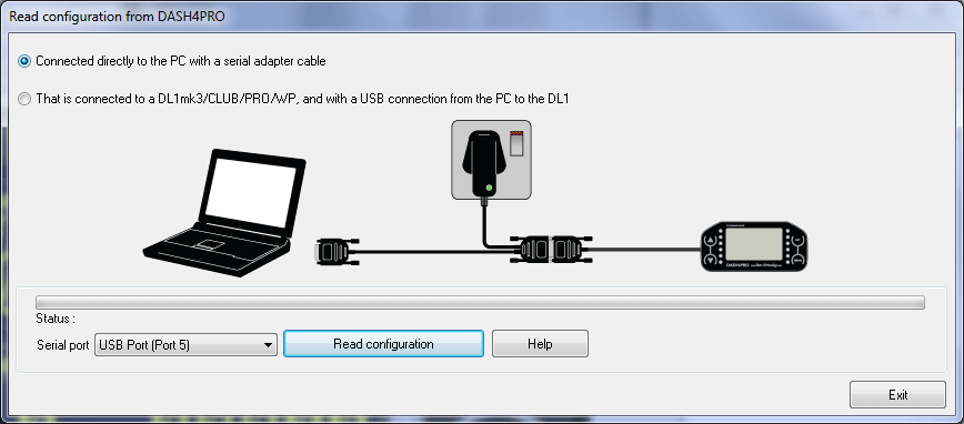 - Click on the menu item File -> Read configuration from DASH4PRO or the Tool bar icon to open the Read configuration from DASH4PRO dialogue.