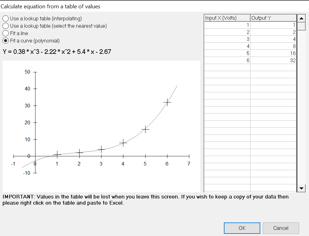 If required, data can be input from a table, by selecting Input Data From a Table the input voltages from the sensor and output readings can be entered.