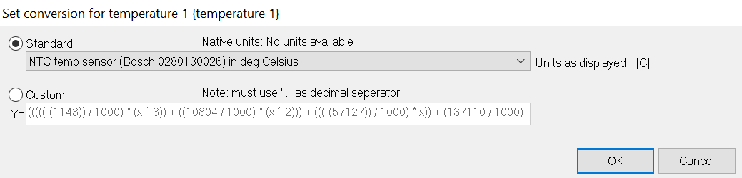 For non-standard sensors the input equation can be entered manually. By clicking on Custom the list of maths functions will be displayed. Equations can be entered using X as the input value, so a typical equation might be: