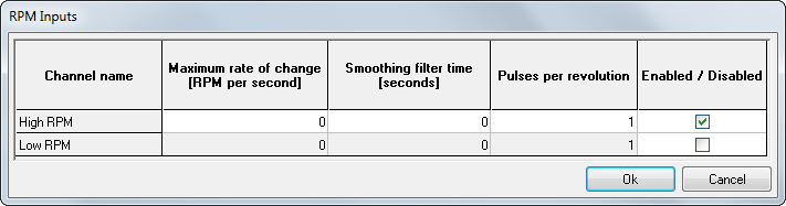 Each input can be enabled or disabled from the RPM inputs configuration box.