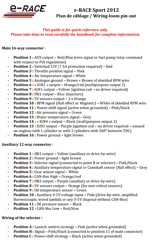 - Connect Race Technology CAN high to Position 6 Orange/red wire.