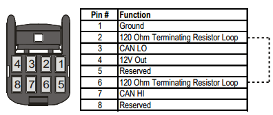 A 120 OHM terminating resistor connected between CAN High & CAN Low terminations may be required for some installations, where the ECU is located at the end of the CAN Bus. The ECU is equipped with an internal terminating resistor which can be enabled by fitting a wire link between pins 2 and 6 of the 8 pin connector.