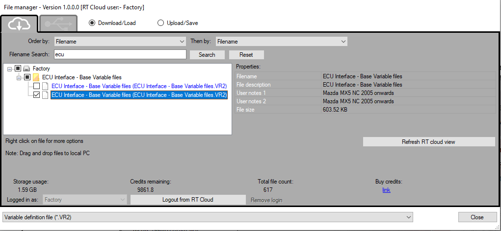 - Variable files contain correct channel naming and units for ECU channels, it is strongly advised to load this into the Race Technology software. Open Variable Manager software from Race Technology program launcher > select .VR2 from the drop down box > type ECU into search bar > open ECU Interface - Base Variable files directory > Click the files and check user notes for vehicle make & model > select desired file then drag & drop onto desktop: