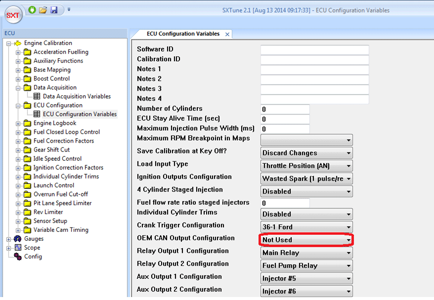 In the specialist components ECU configuration software select the OEM CAN Output configuration to “Not Used” as shown in red below.