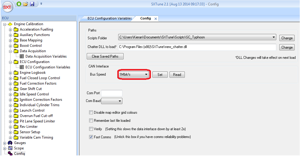 In the specialist components ECU configuration software select CAN baud rate to 1Mbit/s as shown in red below.
