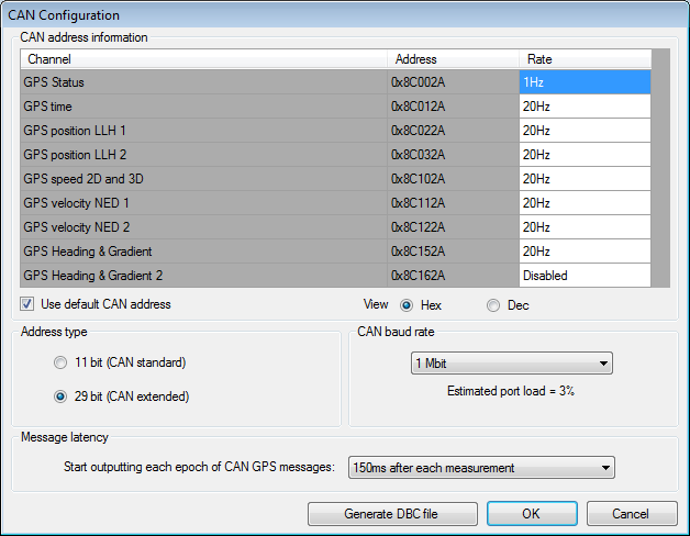 Each CAN message that can be generated by the GPS2 is listed (for more detailed information on the format of each CAN message, please refer to the CAN message reference here). For each message, the CAN address can be independently configured, and the message rate can be set. The dialog will warn if any duplicate addresses are set, and will colour duplicates red to aid identification. The dialog will also calculate the approximate CAN bus loading as the message rates are set.