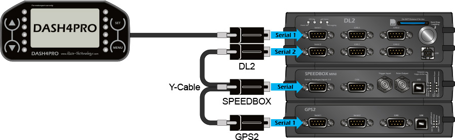 The serial data output from the GPS2 required for the CATS is output from serial port 1 only at a fixed baudrate of 460800 baud. This output must be connected first to the SPEEDBOX, then the DL2, and finally back to the GPS2, using the supplied 3 way cable. Please refer to the diagram.