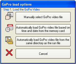 • If the GoPro SD card is currently attached to the PC, then you can automatically load it. This compares the time and data from the data file, with the times and dates on the video files on the memory card and selects the best match. This works very well once the time and dates of the GoPro are known.