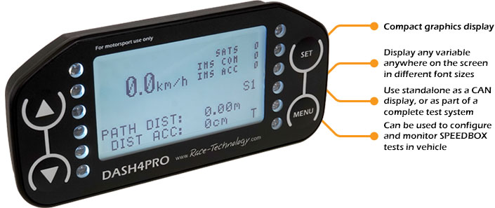 The DASH4PRO FD is a powerful data display, that can be configured for a wide range of applications. It can be used to display CAN data from 3rd party products or data from Race Technology’s range of data logging products. It is housed in small metal case designed for dashboard or steering wheel mounting, there is also an option for a suction mount for windscreen mounting. It can be used to provide either supplementary information along side other instruments, or as the primary source of information in race applications.
