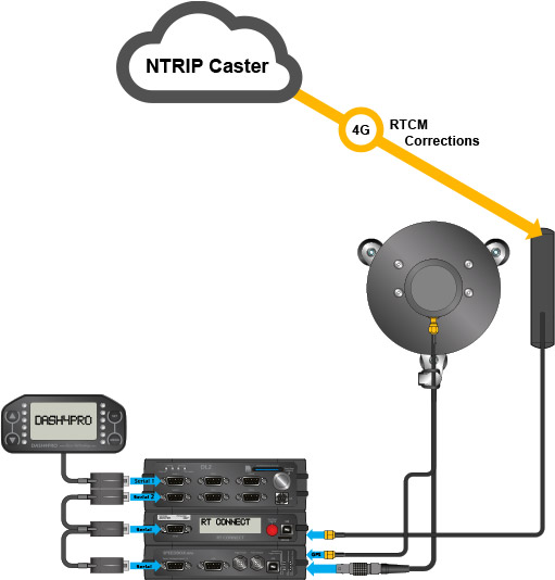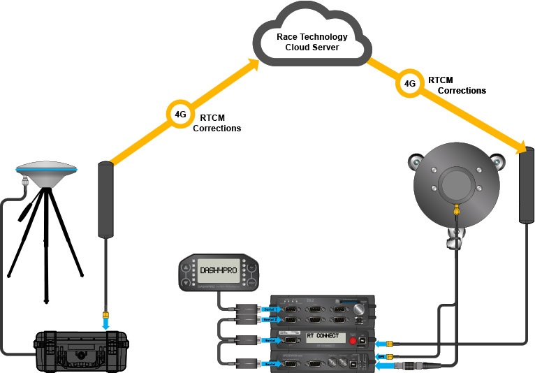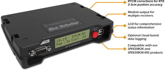 The RT CONNECT is a 4G LTE radio modem which provides RTCM correction information to either Race Technology SPEEDBOX products or to other RTK enabled GNSS receivers which require RTCM format corrections to provide 2cm positioning.