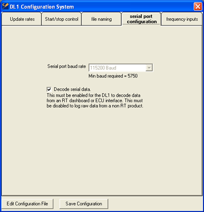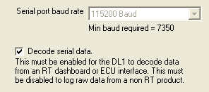 • Switch to the Serial port configuration tab. Make sure that Decode Serial data check box is ticked. This must be enable for the DL1 SPORT to decode data from the DASH2.