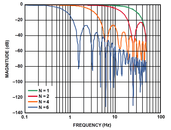 The filter tap value selects the response of the internal low pass filter in the IMU06. The applicable values are from 0 (no filtering) up to 7. Some of the filter output responses are shown below: