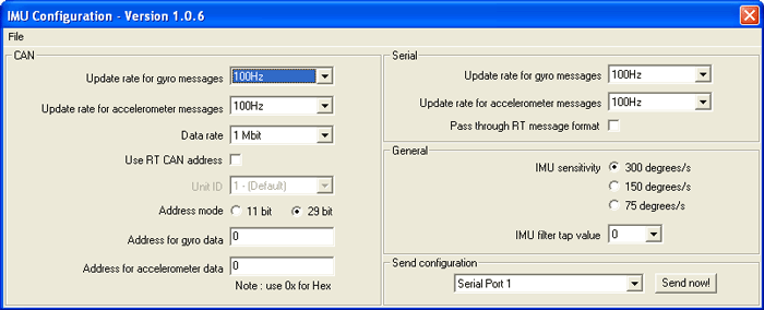 The serial port to which the IMU06 is attached must be selected from the drop down list. To program the new settings in to the IMU06 click on the “Send now!” button and follow the on screen instructions