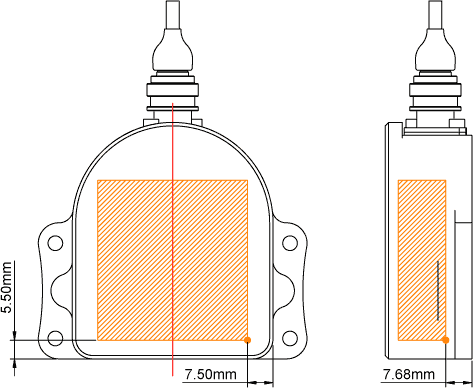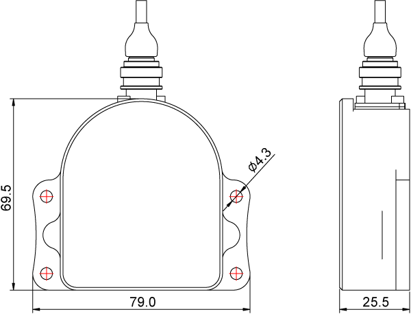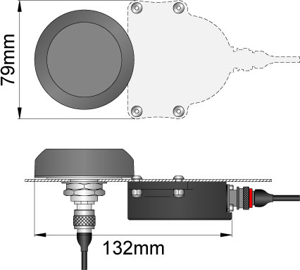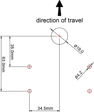 The hardware and direction of travel for this mounting option are shown in figure 4 below, and the mounting hole dimensions are shown in figure 5. Note also that it will be necessary to secure the main IMU cable sufficiently to avoid flexing movement damaging the connector internally - simply using a cable tie to secure to a fixed location within 30cm of the connector would be sufficient, the closer the tie down is to the connector the better.