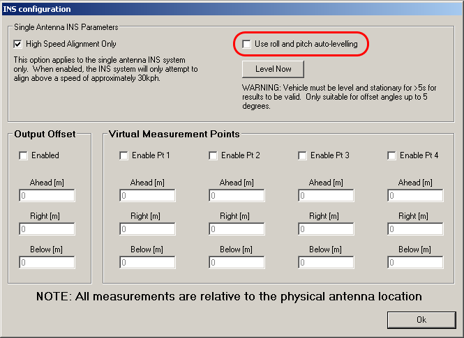 The single antenna SPEEDBOX-INS includes an option to auto-level the antenna in software. This can be used to compensate for small offsets of pitch and roll from the horizontal when it is impossible to mount the antenna perfectly level relative to the vehicle. It is only recommended to use this to compensate for offsets up to approximately 10 degrees in either axis; beyond this a more level mounting should be sought. Using the auto-levelling is entirely optional; it is not necessary to use it at all. The advantages to using it are that when levelled correctly the output pitch and roll will have no constant offset due to the mounting orientation relative to the vehicle. The sensitivity on the lateral and longitudinal accelerometers will also be slightly affected.