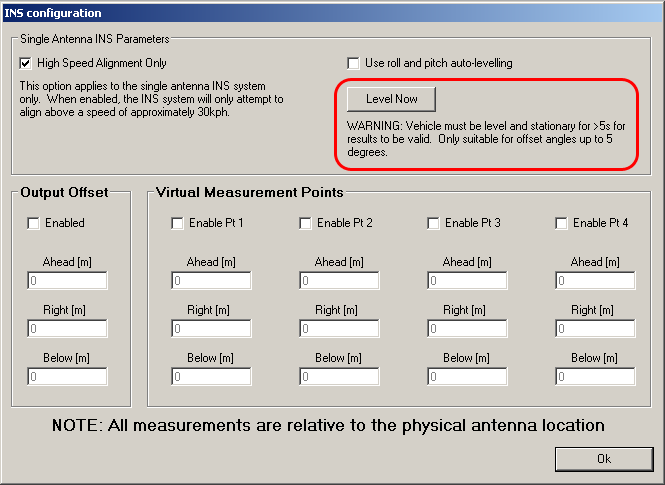 1. Start the configuration software, and open the INS options tab. Press the "Level Now" button (figure 7). This can be done with the configuration software either connected or un-connected.
