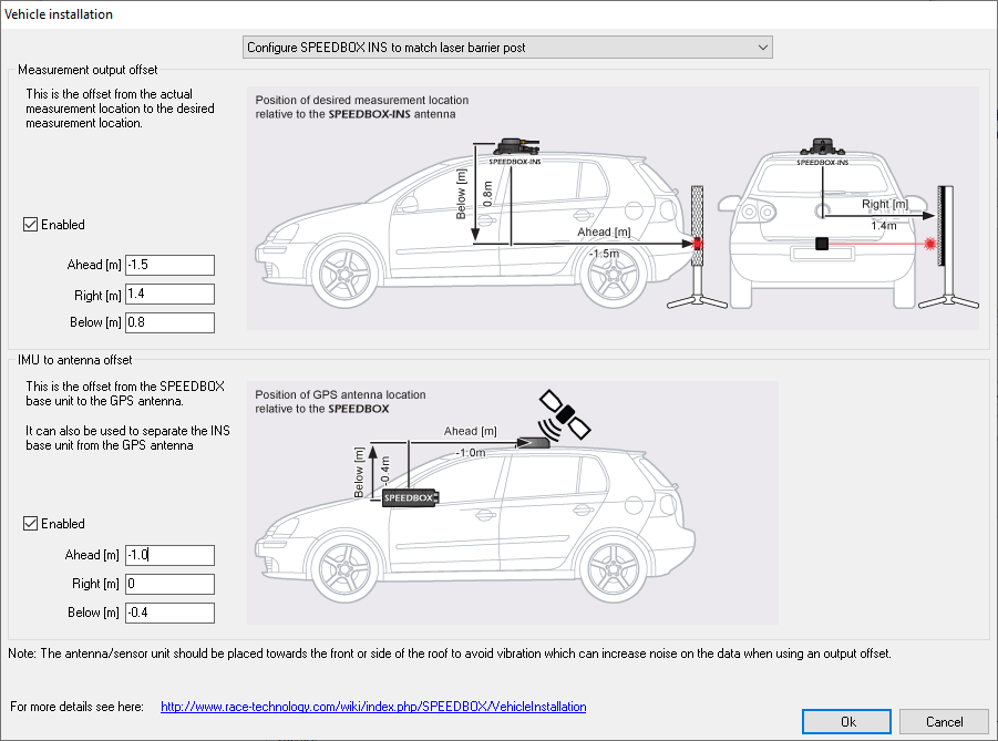 A measurement offset can be set up allowing the SPEEDBOX unit to model the dynamics of the vehicle, referencing the measurement to a specific point on the vehicle, a separate component such as a laser barrier used for triggering a test, or a reference system for direct comparison. Configuring this function correctly results in increased accuracy.