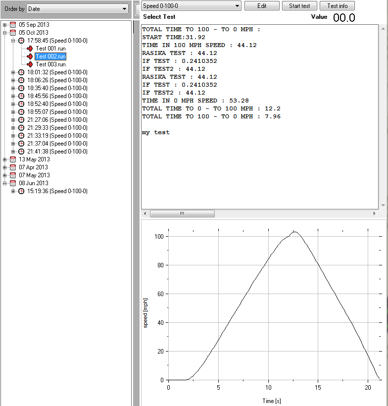 The graph can be configured by the script. By specifying a variable and its Min, Max values in the script the graph can be set to manual scale, or else it is set to auto scale. In graph the X axis denotes time and Y axis will denote values according to the variable defined in the script (speed, break, RPM, etc.). If multiple tests are performed within the same script then the lines will overlay on the display.